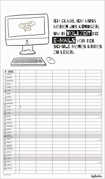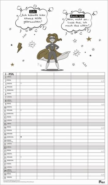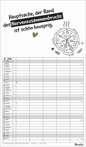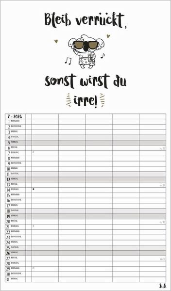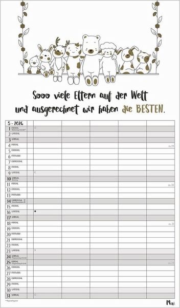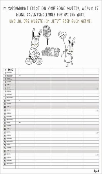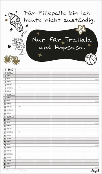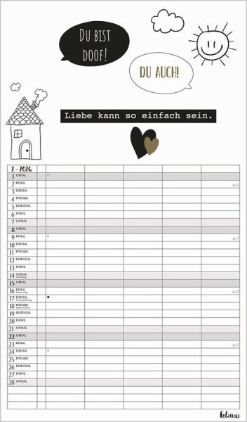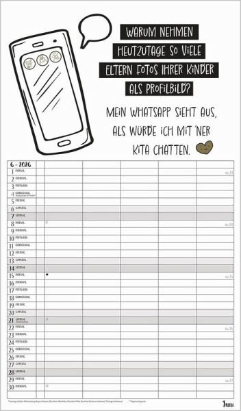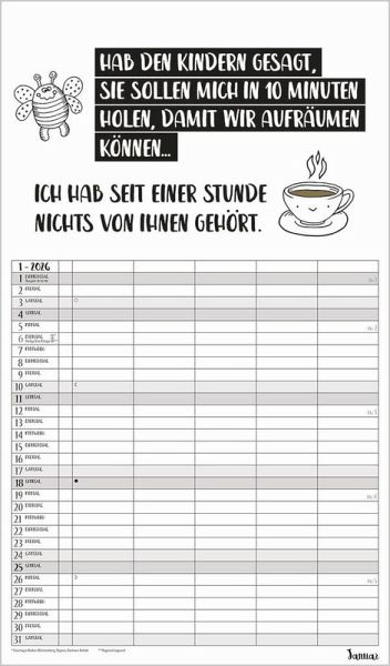 Der trendige Lifestyle-Kalender für alle TypoArt-Fans! Mit 12 witzigen Sprüchen und coolen Statements rund ums Familienleben. Schwarz-Weiß-Design kombiniert mit Metallic-Goldfarbe setzt Ihre Termine gekonnt in Szene. Zugleich profitieren Sie von der hohen Funktionalität eines modernen Terminplaners: 5 Spalten, Kalendarium, Ferientermine und Vorschau bis März des Folgejahres.