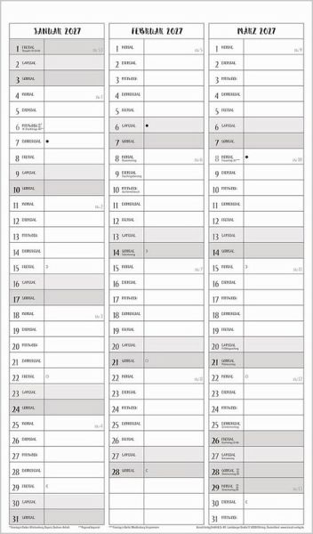 Übersichtlicher Familienplaner, 5 große Spalten; Format: 27x46 cm Praktische Zusatzspalte für Ferien, Müll und weitere Aktivitäten; stabile Rückwand Viel Platz für Eintragungen, ohne störende Bilder in den Spalten leichte Beschreibbarkeit, auch mit Bunt- und Bleistiften Deutsches Kalendarium mit regionalen Feiertagen für D, A und CH Gedruckt auf dickem und umweltfreundlichem FSC Papier