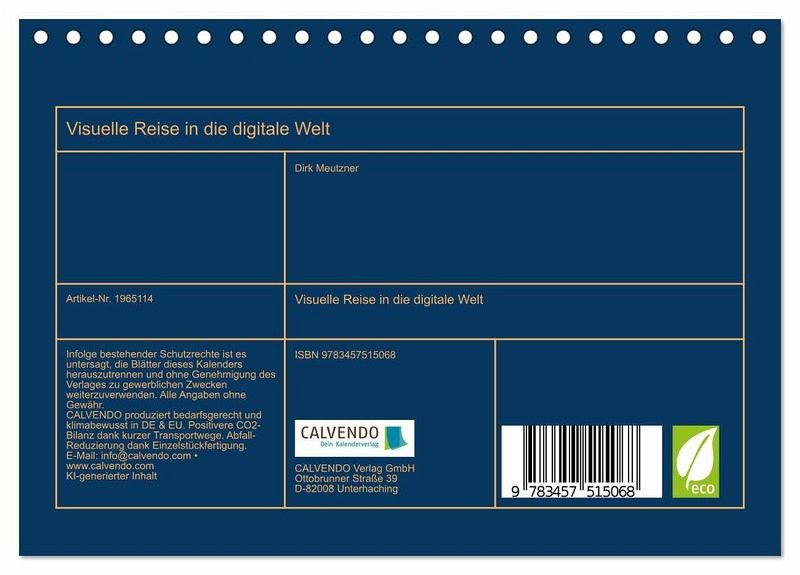 Tauchen Sie ein in die faszinierende Welt der Computer mit unserem einzigartigen Kalender! Lassen Sie sich von atemberaubenden Bildern und spannenden Fakten verzaubern, während Sie Monat für Monat in die Tiefen der Technologie eintauchen.Jede Seite ist ein Fenster zu den neuesten Innovationen, den aufregendsten Gadgets und den revolutionären Entwicklungen der digitalen Welt. Entdecken Sie die futuristische Schönheit von High-Tech-Designs und lassen Sie sich von den Möglichkeiten begeistern, die uns die Computerwelt bietet.Von künstlicher Intelligenz bis hin zu Virtual Reality - unser Kalender entführt Sie in die Welt der Algorithmen, Codes und digitalen Kreationen. Geben Sie Ihrem Büro, Ihrer Küche oder Ihrem Schlafzimmer einen Hauch von Innovation und bringen Sie mit unserem Kalender "Visuelle Reise in die digitale Welt" frischen Wind in Ihren Alltag. Seien Sie stets up to date über die neuesten Trends und lassen Sie sich von der Zukunftsvision der Computertechnologie begeistern.Sichern Sie sich noch heute unseren Kalender und tauchen Sie ein in eine Welt voller Bits und Bytes, die Ihr Herz höherschlagen lässt. Verpassen Sie nicht diese einzigartige Gelegenheit, Ihren Horizont zu erweitern und den Geist der Computerrevolution zu spüren. Bestellen Sie jetzt "Visuelle Reise in die digitale Welt"!Erstellt wurde er im übrigen mit Ki und Photoshop.