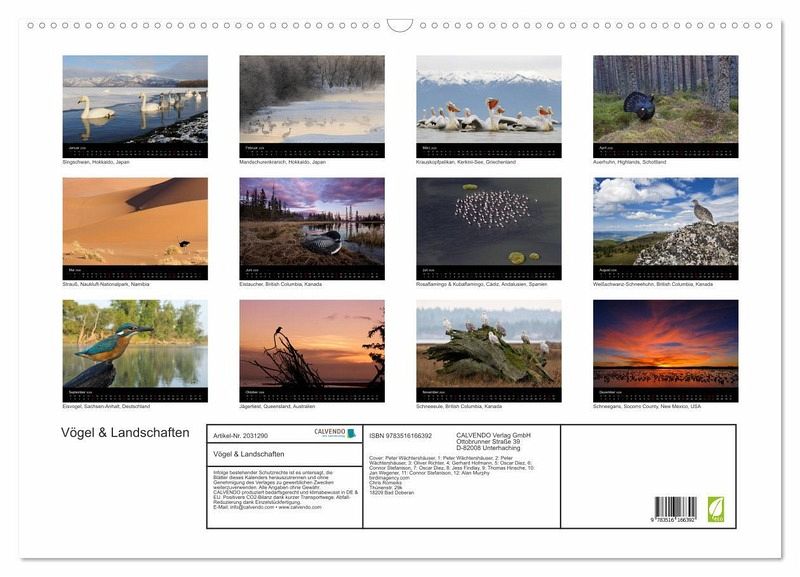 Einen Vogelbildkalender der besonderen Art hat die Bildagentur birdimagency.com kreiert. Es werden Vogelarten in atemberaubend schönen Landschaften, Stimmungen und Perspektiven präsentiert.