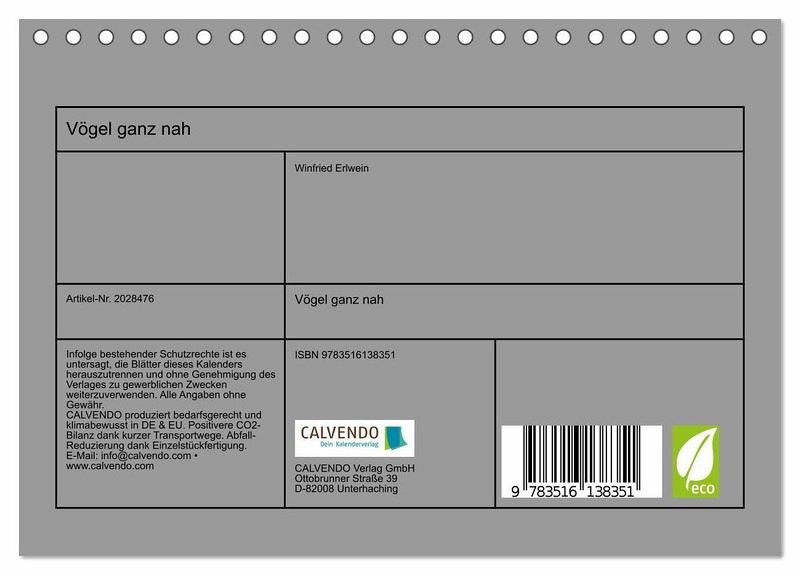 QUALITÄT - Hochwertiger Fotokalender mit 12 wunderschönen Motiven auf lichtbeständigem Bilderdruckpapier, robuste Spiralbindung.NACHHALTIG - deutliche Abfallreduzierung durch bedarfsgerechte Einzelstückfertigung, umweltfreundliches FSC-zertifiziertes Papier, Produktion in Deutschland, klimabewusste Logistik.PERFEKTES GESCHENK - Kalender für Freunde und Familie, für Kinder und Erwachsene, jung und alt, zu Weihnachten, Geburtstag oder zwischendurch.VIELFALT - Bildkalender in verschiedenen Formaten, z.B. DIN A5, DIN A4, DIN A3 sowie DIN A2. Ob Naturmotiv, Gemälde oder Fotos, ideal für ein persönliches Wohlfühlambiente.Seltene einheimische Vögel aus nächster Nähe fotografiert von Autor(in): Winfried Erlwein