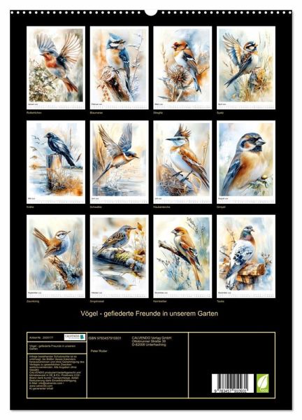 Tauchen Sie ein in die farbenfrohe Welt unserer gefiederten Gartenfreunde. Heimische Vögel zeigen sich in liebevoller zarter Aquarellkunst - mal zwischen knorrigen Ästen, mal am glitzernden Wasser oder in blühenden Sträuchern. Jeder Blick auf diese bezaubernde KI-Bilder erzählt von Ruhe, Naturverbundenheit und dem Zauber stiller Momente. Ein Kalender, der Herz und Augen erfreut - perfekt für Naturliebhaber und alle, die die kleinen Schönheiten des Alltags schätzen.