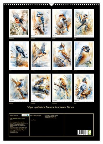 Tauchen Sie ein in die farbenfrohe Welt unserer gefiederten Gartenfreunde. Heimische Vögel zeigen sich in liebevoller zarter Aquarellkunst - mal zwischen knorrigen Ästen, mal am glitzernden Wasser oder in blühenden Sträuchern. Jeder Blick auf diese bezaubernde KI-Bilder erzählt von Ruhe, Naturverbundenheit und dem Zauber stiller Momente. Ein Kalender, der Herz und Augen erfreut - perfekt für Naturliebhaber und alle, die die kleinen Schönheiten des Alltags schätzen.