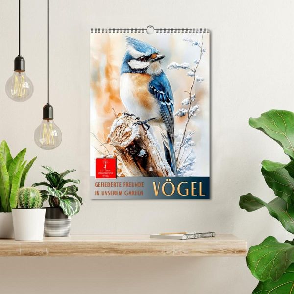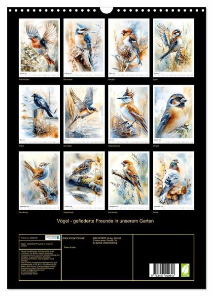 Tauchen Sie ein in die farbenfrohe Welt unserer gefiederten Gartenfreunde. Heimische Vögel zeigen sich in liebevoller zarter Aquarellkunst - mal zwischen knorrigen Ästen, mal am glitzernden Wasser oder in blühenden Sträuchern. Jeder Blick auf diese bezaubernde KI-Bilder erzählt von Ruhe, Naturverbundenheit und dem Zauber stiller Momente. Ein Kalender, der Herz und Augen erfreut - perfekt für Naturliebhaber und alle, die die kleinen Schönheiten des Alltags schätzen.