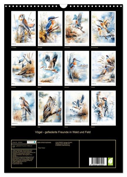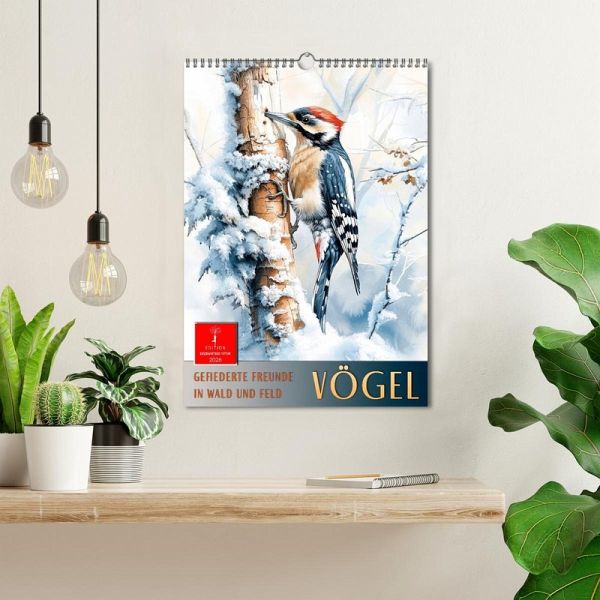 Tauchen Sie ein in die zauberhafte Welt unserer heimischen Vogelarten. Dieser Kalender präsentiert kunstvoll gestaltete KI-Bilder unserer heimischen Vögel in Wald und Feld. Erleben Sie unter anderem Kranich, Specht, Storch und Eisvogel - eingefangen in ihrer natürlichen Umgebung. Egal, ob auf zarten Ästen, blühenden Sträuchern oder am glitzernden Wasser - die einzelnen Aquarell-Darstellungen bringen die Schönheit dieser Vögel direkt in Ihr Zuhause. Lassen Sie sich jeden Monat von einem neuen gefiederten Freund verzaubern. Ein Muss für Vogelliebhaber und Kunstbegeisterte gleichermaßen.