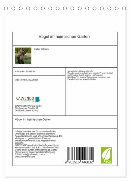 QUALITÄT - Hochwertiger Fotokalender mit 12 wunderschönen Motiven auf lichtbeständigem Bilderdruckpapier, robuste Spiralbindung.NACHHALTIG - deutliche Abfallreduzierung durch bedarfsgerechte Einzelstückfertigung, umweltfreundliches FSC-zertifiziertes Papier, Produktion in Deutschland, klimabewusste Logistik.PERFEKTES GESCHENK - Kalender für Freunde und Familie, für Kinder und Erwachsene, jung und alt, zu Weihnachten, Geburtstag oder zwischendurch.VIELFALT - Bildkalender in verschiedenen Formaten, z.B. DIN A5, DIN A4, DIN A3 sowie DIN A2. Ob Naturmotiv, Gemälde oder Fotos, ideal für ein persönliches Wohlfühlambiente.Wunderschöne Aufnahmen, die die Pracht, Vielfalt und Einzigartigkeit unserer "gefiederten Nachbarn" in unsere Wohnräume bringen - eine Freude für jeden Vogelliebhaber. von Autor(in): Dieter Wilczek