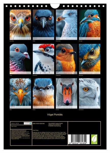 Entdecken Sie die vielfältige Schönheit unserer heimischen Vögel. Egal ob Rotkehlchen, Amsel oder Schwan, lassen Sie sich verzaubern von den Detailaufnahmen, die die leuchtenden Farben, das komplizierte Gefieder und die fesselnden Augen und Schnäbel zur Geltung bringen. Der Fotokünstler Peter Roder hat wunderschöne KI-Porträtbilder gestaltet und zusammengestellt. Tauchen Sie mit diesem Vögel - Porträt-Kalender ein in die bezaubernde Anziehungskraft unserer heimischen Vogelwelt.