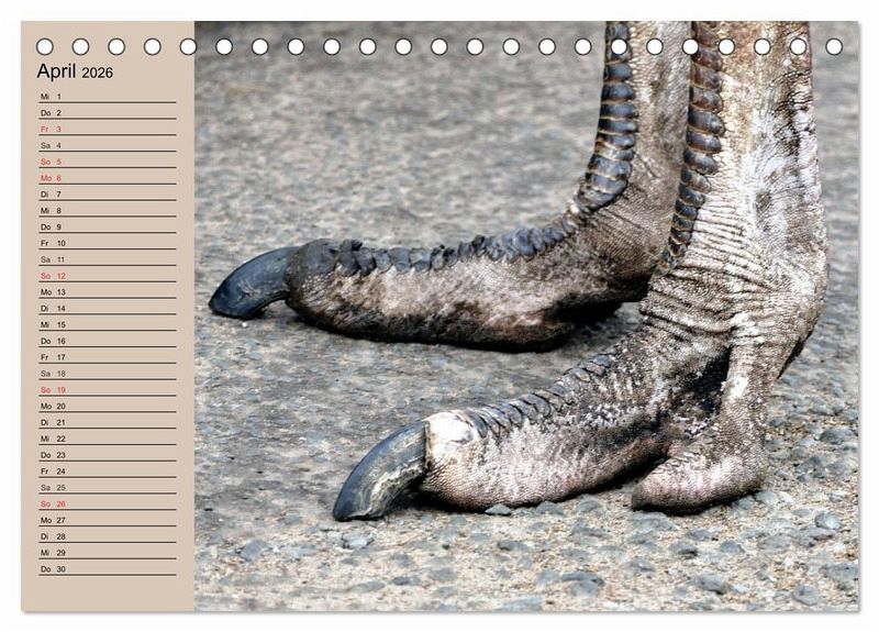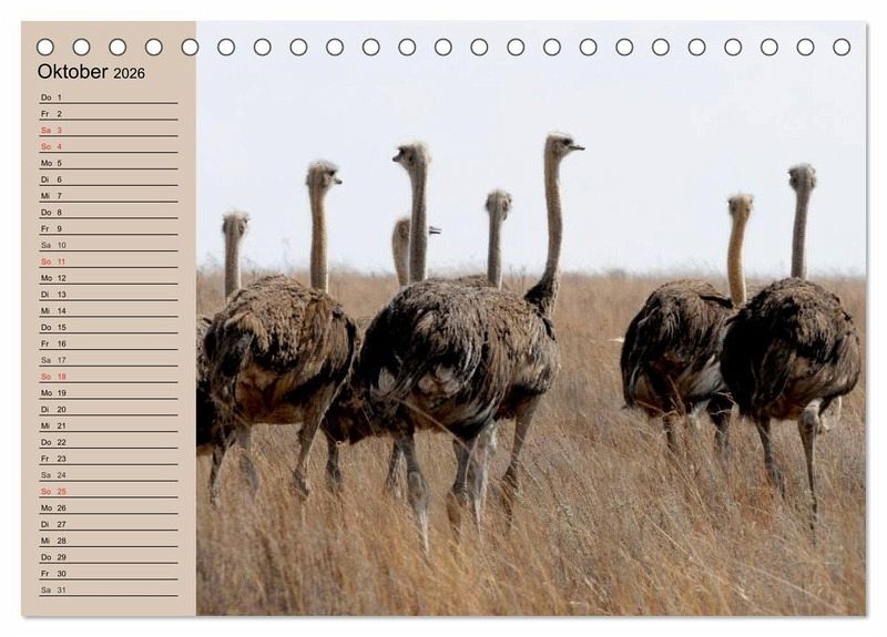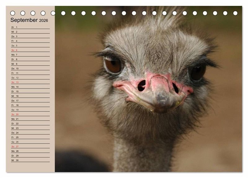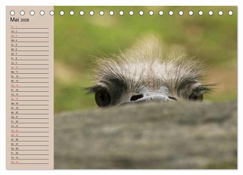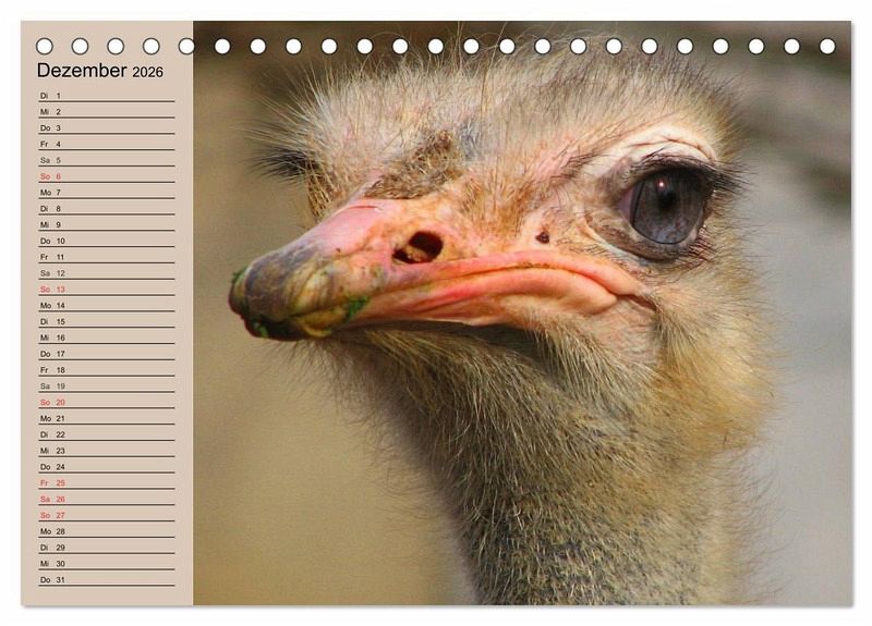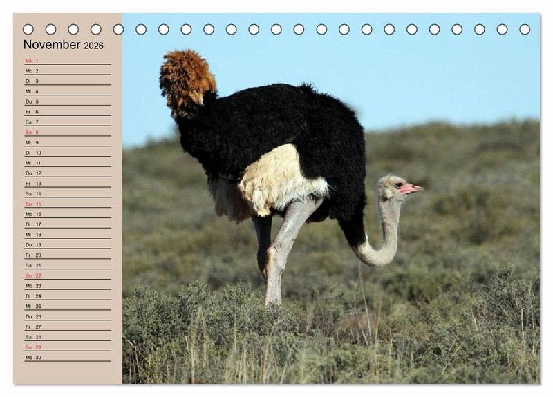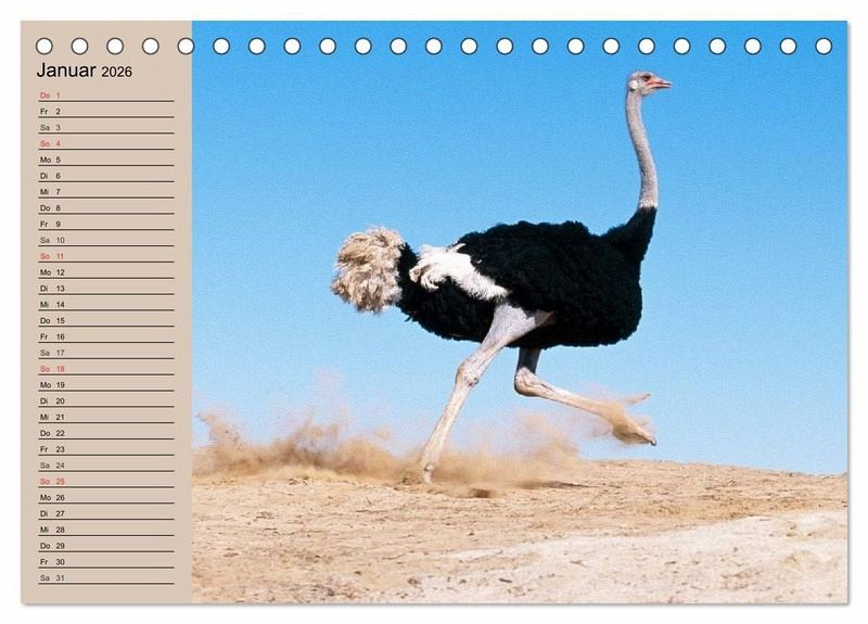 Es gibt heute nur noch eine Straußenart und zwar den Afrikanischen Strauß. Funde zeigen, dass er auch einmal in Asien und Europa beheimatet war. Aufgrund seiner schönen Federn und seines Fleisches wurde er in vielen Regionen leider fast ausgerottet. Der Strauß ist ein beeindruckender Vogel mit wirklich lustigem Gesicht und wenn er Angst bekommt, läuft er mit enormer Geschwindigkeit einfach weg. Ein schöner Planer für die ganze Familie.