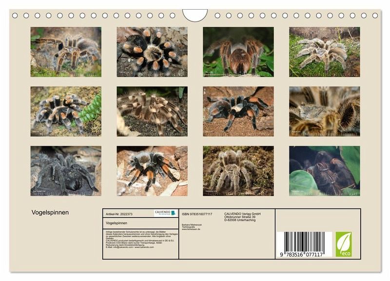 QUALITÄT - Hochwertiger Fotokalender mit 12 wunderschönen Motiven auf lichtbeständigem Bilderdruckpapier, robuste Spiralbindung mit Aufhängebügel.NACHHALTIG - deutliche Abfallreduzierung durch bedarfsgerechte Einzelstückfertigung, umweltfreundliches FSC-zertifiziertes Papier, Produktion in Deutschland, klimabewusste Logistik.PERFEKTES GESCHENK - Kalender für Freunde und Familie, für Kinder und Erwachsene, jung und alt, zu Weihnachten, Geburtstag oder zwischendurch.VIELFALT - Bildkalender in verschiedenen Formaten, z.B. DIN A5, DIN A4, DIN A3 sowie DIN A2. Ob Naturmotiv, Gemälde oder Fotos, ideal für ein persönliches Wohlfühlambiente.12 Fotos der Theraphosidae von Autor(in): Barbara Mielewczyk