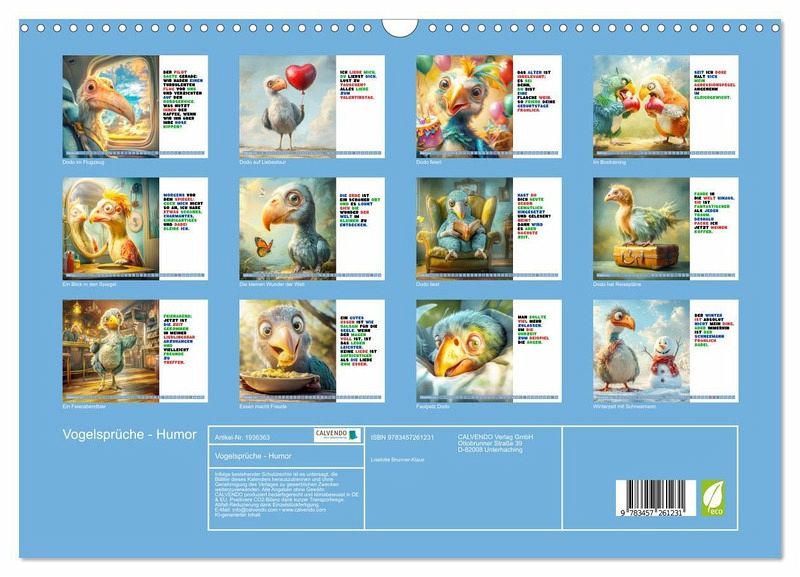 Entdecke die humorvolle Welt der Vogelsprüche mit den charmanten Vögeln, die dem Dodo-Vogel nachempfunden sind. Die KI-generierten Werke zeigen diesen liebenswerten Charakter in einer Vielzahl von amüsanten Situationen, sei es beim Boxkampf, im Flugzeug, vor dem Spiegel oder gemütlich mit einer Tasse Kaffee. Jeder Moment wird von einem witzigen Spruch begleitet, der garantiert ein Lächeln auf dein Gesicht zaubert. Diese Sammlung ist ein absolutes Muss für alle Freunde witziger Figuren und für alle, die eine Portion Spaß und gute Laune schätzen. Lass dich von den Sprüchen und den liebevollen Darstellungen inspirieren und genieße die humorvolle Seite des Lebens.