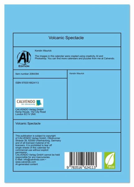QUALITY - High-quality photo calendar with 12 beautiful images on light-resistant paper, robust spiral binding.SUSTAINABLE - Significant waste reduction due to print-on-demand production, environmentally friendly FSC-certified paper, produced locally, climate-conscious logistical processes.PERFECT GIFT - calendars for friends and family, for children, all ages and all occasions, from Christmas to birthdays and everything in between.LOTS OF CHOICE - Wall calendars in different sizes (DIN A4 and DIN A3), for any topic and personal taste, featuring photography, painting and illustrations.A year full of fire, power and beauty - majestic volcanoes in their most impressive form von Autor(in): Kerstin Waurick