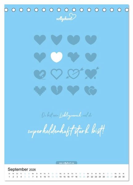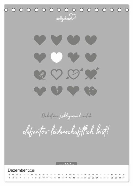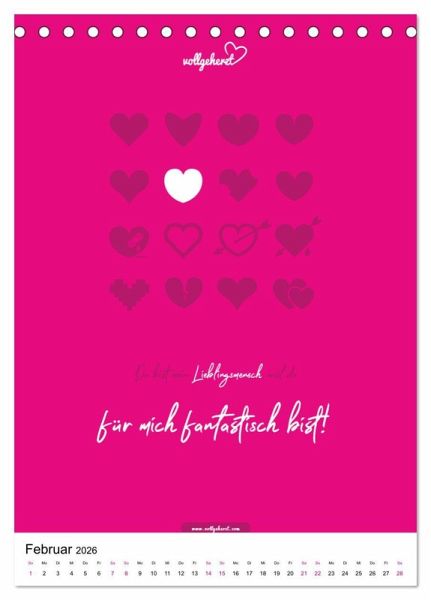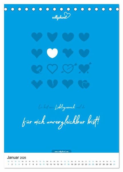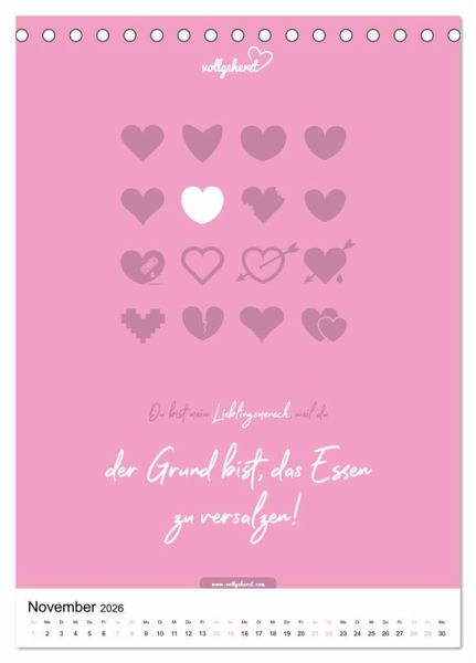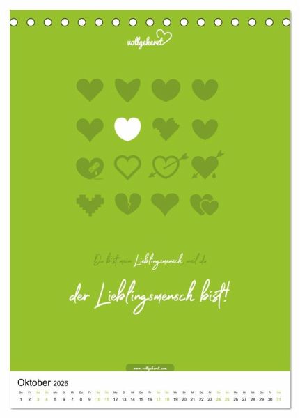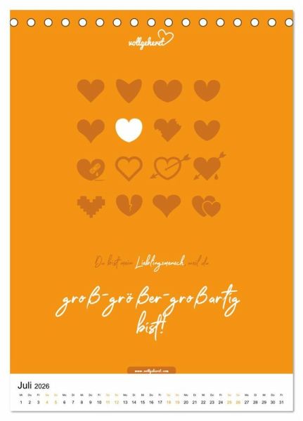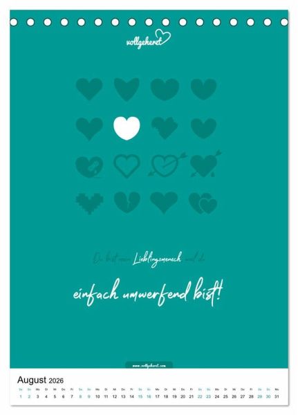 Dieser besondere Wandkalender oder auch Jahreskalender der Produktlinie "vollgeherzt" ist nicht nur eine normale Wanddekoration mit Monats- und Tagesangaben, sondern eine Art Zuneigungsbekundung für den Lieblingsmensch. Das perfekte Geschenk für die Mama, die beste Freundin, die Tante, die Cousine etc. Bitte fühlen Sie sich vollgeherzt - Ihr Leo Vollgeherzt