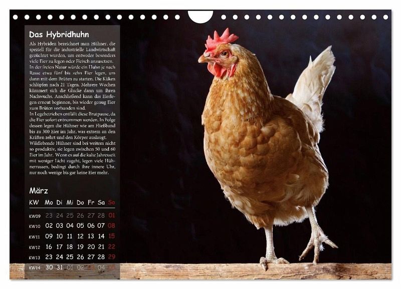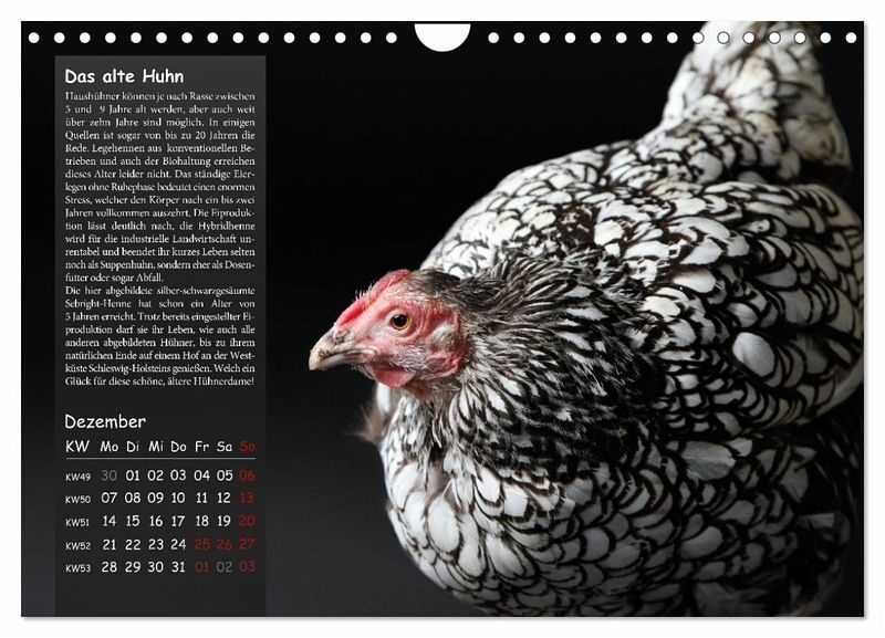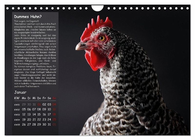 Dieser Kalender gehört zu den CALVENDO-Topsellern. Neben künstlerischen Fotografien bietet er einen informativen Einblick in die Welt der Haushühner, beschreibt die Eigenarten und Besonderheiten dieser außergewöhnlichen Geschöpfe und erinnert uns leise daran, dass auch sie das Recht auf ein schönes, artgerechtes Leben haben: Eine neue Perspektive auf das "Nutztier" Huhn.