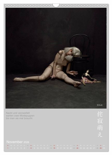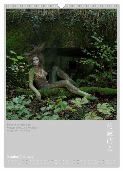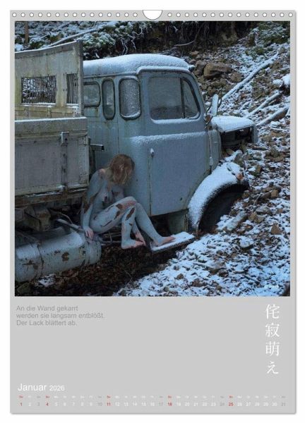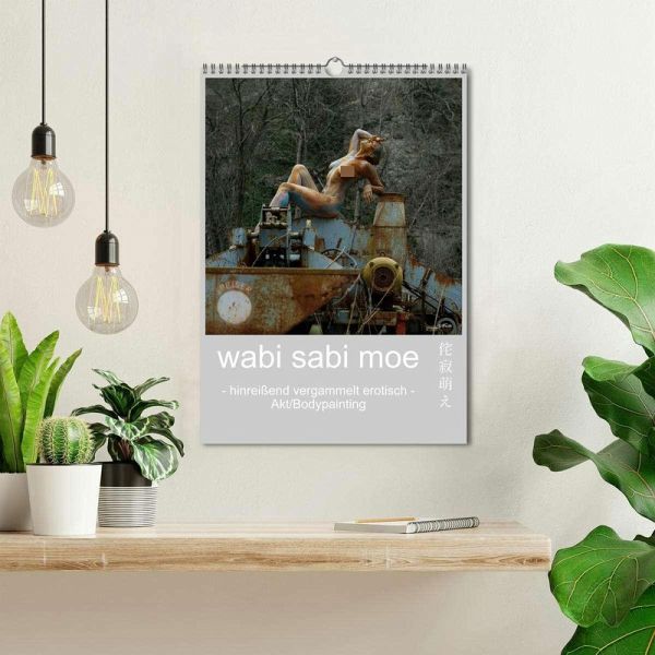 Übermut, sinnliche Jugend und Schamlosigkeit auf der einen Seite - liegen gelassener Plunder und Zeugnisse von vergangenem Fleiß auf der anderen Seite - sind das Spannungsfeld, in dem die Bodypainting/Akt-Kalenderbilder entstanden sind. "WABI SABI" ist ein japanisches Schönheitskonzept, das elend, verloren und alt sein kombiniert, und das in der westlichen Ästhetik zunehmend Beachtung findet. "MOE" gibt ursprünglich die Sicht des Zen von einer Welt in kindlicher Naivität und Spontaneität wieder. Die Bedeutung in der Comic-Kultur heute kann übersetzt werden mit "Fan sein von ...".