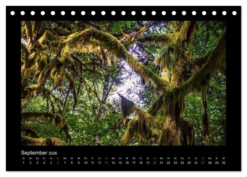 Ein Kalender für jeden, der sich für Wälder interessiert und die Landschaften, in denen sie entstehen. Es werden Bilder gezeigt vom gepflegten deutschen Wald, den kargen Landschaften Afrikas, der prallen Vielfalt Australiens und von einem der letzten Regenwälder der Vereinigten Staaten, dem Olympic National Park. Eine Besonderheit bieten in Afrika die Köcherbaumwälder. Sie sind besonders angepasst, vertragen große Hitze und lange Perioden ohne Wasser. Da es nicht sehr viele gibt, werden schon kleinste Gruppen als Wald bezeichnet. Das letzte Bild zeigt (wieder in den USA) Reste eines toten Walds, der durch das aggressive Wasser des Yellowstone langsam vernichtet wird.