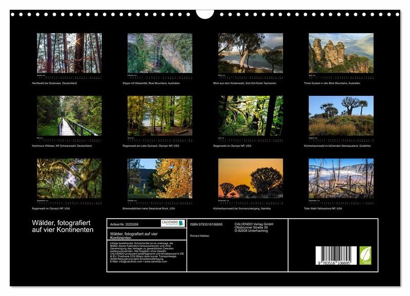 QUALITÄT - Hochwertiger Fotokalender mit 12 wunderschönen Motiven auf lichtbeständigem Bilderdruckpapier, robuste Spiralbindung mit Aufhängebügel.NACHHALTIG - deutliche Abfallreduzierung durch bedarfsgerechte Einzelstückfertigung, umweltfreundliches FSC-zertifiziertes Papier, Produktion in Deutschland, klimabewusste Logistik.PERFEKTES GESCHENK - Kalender für Freunde und Familie, für Kinder und Erwachsene, jung und alt, zu Weihnachten, Geburtstag oder zwischendurch.VIELFALT - Bildkalender in verschiedenen Formaten, z.B. DIN A5, DIN A4, DIN A3 sowie DIN A2. Ob Naturmotiv, Gemälde oder Fotos, ideal für ein persönliches Wohlfühlambiente.Waldlandschaften, fotografiert in Deutschland, USA, Namibia, Südafrika, Tasmanien und Australien von Autor(in): Richard Walliser