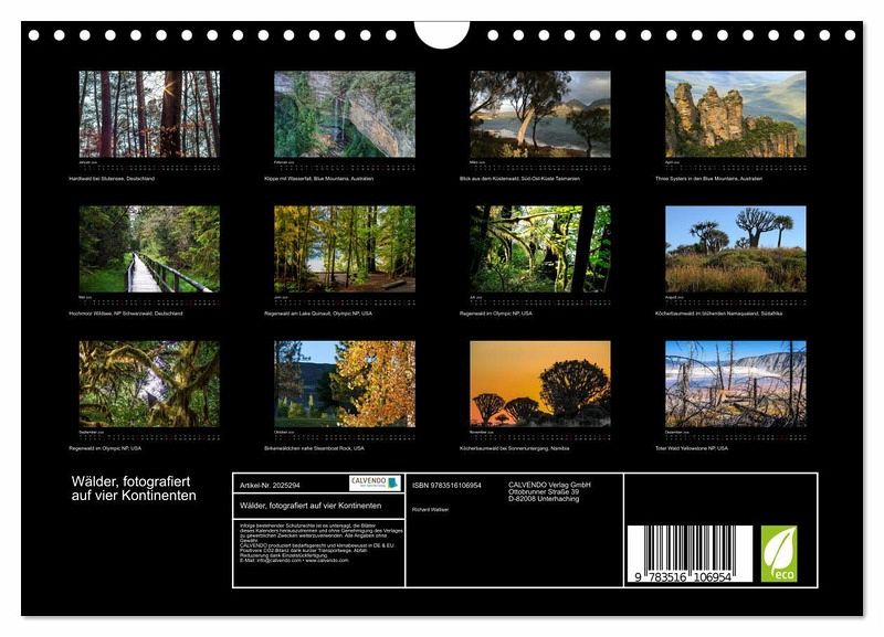QUALITÄT - Hochwertiger Fotokalender mit 12 wunderschönen Motiven auf lichtbeständigem Bilderdruckpapier, robuste Spiralbindung mit Aufhängebügel.NACHHALTIG - deutliche Abfallreduzierung durch bedarfsgerechte Einzelstückfertigung, umweltfreundliches FSC-zertifiziertes Papier, Produktion in Deutschland, klimabewusste Logistik.PERFEKTES GESCHENK - Kalender für Freunde und Familie, für Kinder und Erwachsene, jung und alt, zu Weihnachten, Geburtstag oder zwischendurch.VIELFALT - Bildkalender in verschiedenen Formaten, z.B. DIN A5, DIN A4, DIN A3 sowie DIN A2. Ob Naturmotiv, Gemälde oder Fotos, ideal für ein persönliches Wohlfühlambiente.Waldlandschaften, fotografiert in Deutschland, USA, Namibia, Südafrika, Tasmanien und Australien von Autor(in): Richard Walliser
