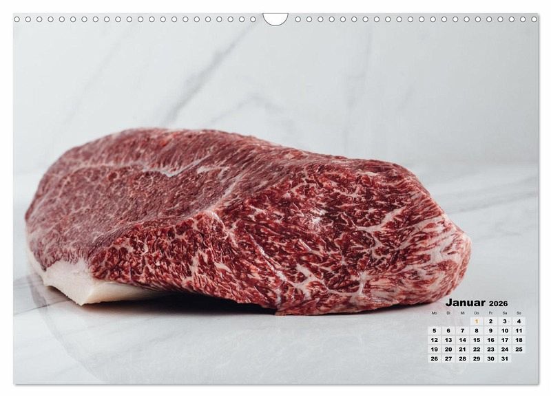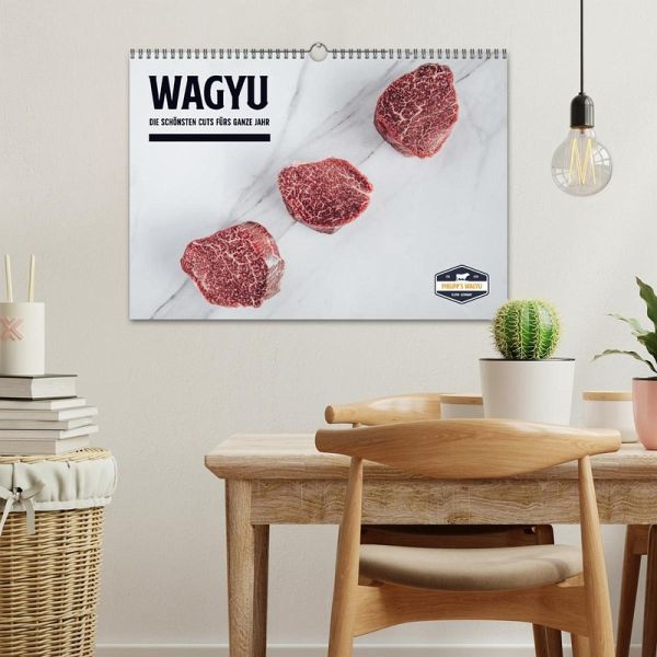 Das wohl edelste Fleisch der Welt: puristisch inszeniert, leuchtend, roh. Wagyu. Beim Anblick der gekonnten Symbiose aus strahlend weißem Fett und dem leuchtenden Rot des perfekt gereiften Fleisches läuft einem schockartig das Wasser im Mund zusammen. Der Puls fängt an zu pochen. Ehe man sich versieht, schießt es einem völlig fleischverliebt durch den Kopf, wie schön es jetzt wäre, das Steak auszuschneiden und auf den Grill zu legen ... Das wäre allerdings zu schade für die vollendete Fleischkunst, an dem jeder Carnivore das ganze Jahr lang seine Freude haben wird.