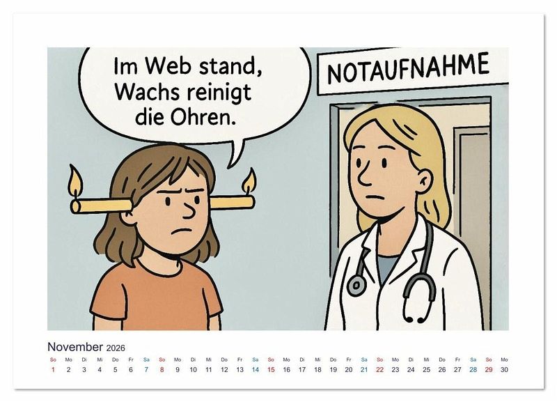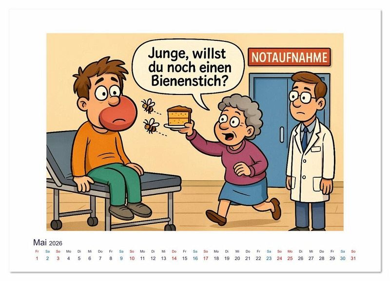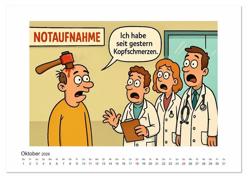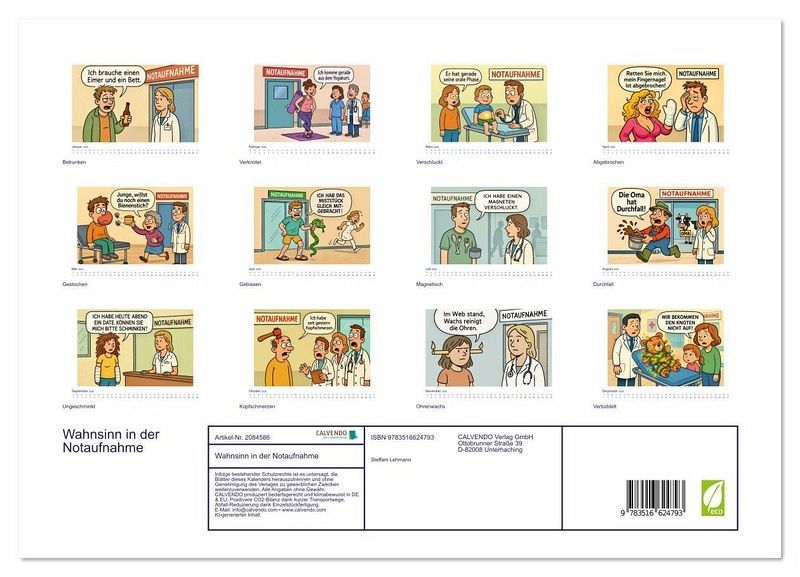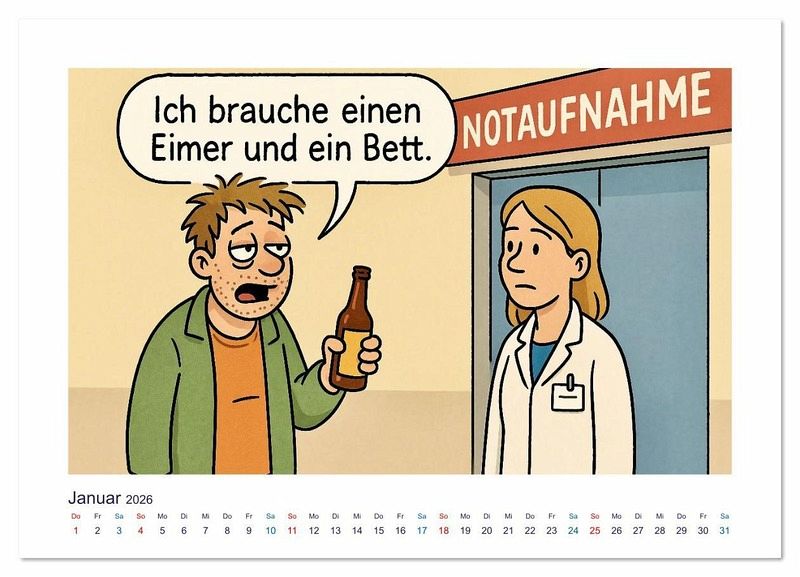 Dieser einzigartige Kalender bringt den turbulenten Alltag der Notaufnahme mit viel Humor auf den Punkt. Zwölf liebevoll und detailreich illustrierte Szenen, die Steffani Lehmann mit Unterstützung einer KI editiert hat, zeigen skurrile Patienten, schräge Missverständnisse und den manchmal ganz normalen Irrsinn zwischen Blaulicht und Wartezimmer.