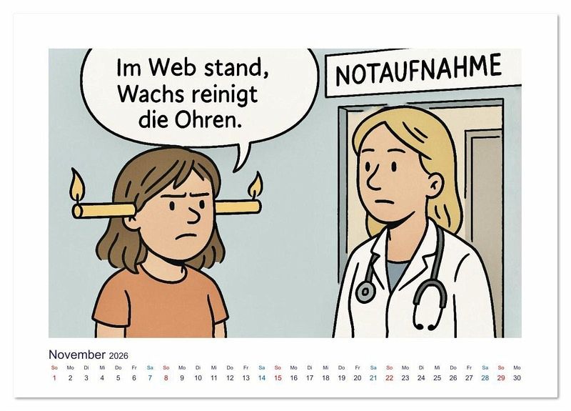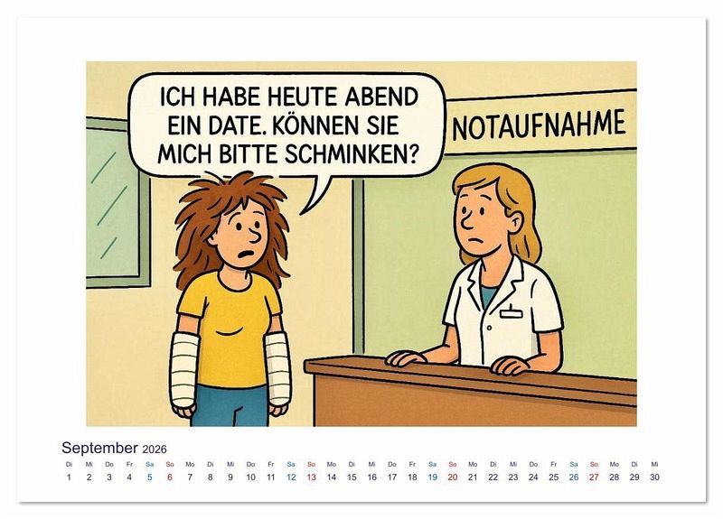 Dieser einzigartige Kalender bringt den turbulenten Alltag der Notaufnahme mit viel Humor auf den Punkt. Zwölf liebevoll und detailreich illustrierte Szenen, die Steffani Lehmann mit Unterstützung einer KI editiert hat, zeigen skurrile Patienten, schräge Missverständnisse und den manchmal ganz normalen Irrsinn zwischen Blaulicht und Wartezimmer.