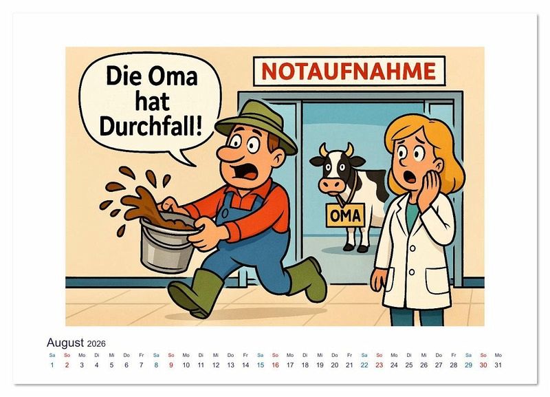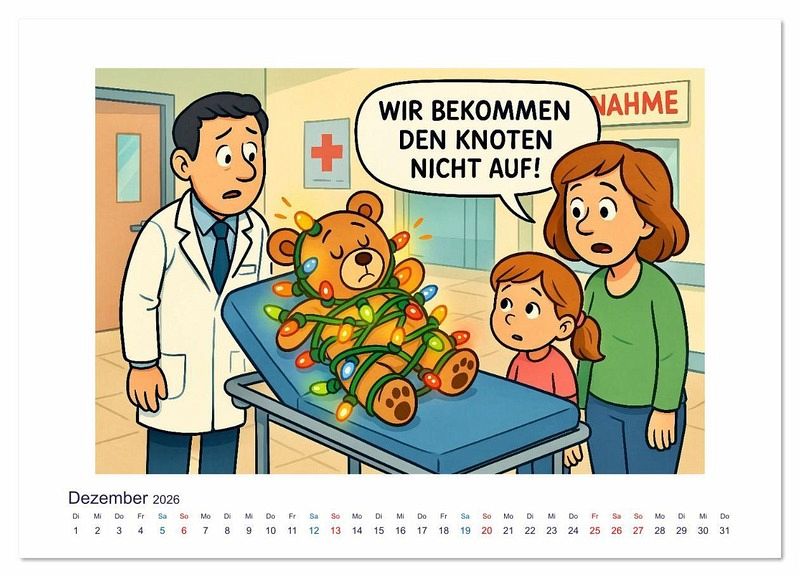 Dieser einzigartige Kalender bringt den turbulenten Alltag der Notaufnahme mit viel Humor auf den Punkt. Zwölf liebevoll und detailreich illustrierte Szenen, die Steffani Lehmann mit Unterstützung einer KI editiert hat, zeigen skurrile Patienten, schräge Missverständnisse und den manchmal ganz normalen Irrsinn zwischen Blaulicht und Wartezimmer.