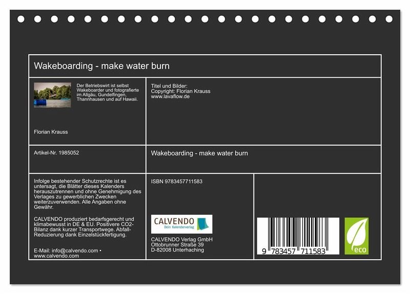 QUALITÄT - Hochwertiger Fotokalender mit 12 wunderschönen Motiven auf lichtbeständigem Bilderdruckpapier, robuste Spiralbindung.NACHHALTIG - deutliche Abfallreduzierung durch bedarfsgerechte Einzelstückfertigung, umweltfreundliches FSC-zertifiziertes Papier, Produktion in Deutschland, klimabewusste Logistik.PERFEKTES GESCHENK - Kalender für Freunde und Familie, für Kinder und Erwachsene, jung und alt, zu Weihnachten, Geburtstag oder zwischendurch.VIELFALT - Bildkalender in verschiedenen Formaten, z.B. DIN A5, DIN A4, DIN A3 sowie DIN A2. Ob Naturmotiv, Gemälde oder Fotos, ideal für ein persönliches Wohlfühlambiente.Wakeboarding - make water burn von Autor(in): Florian Krauss