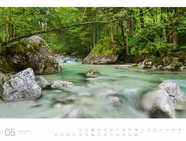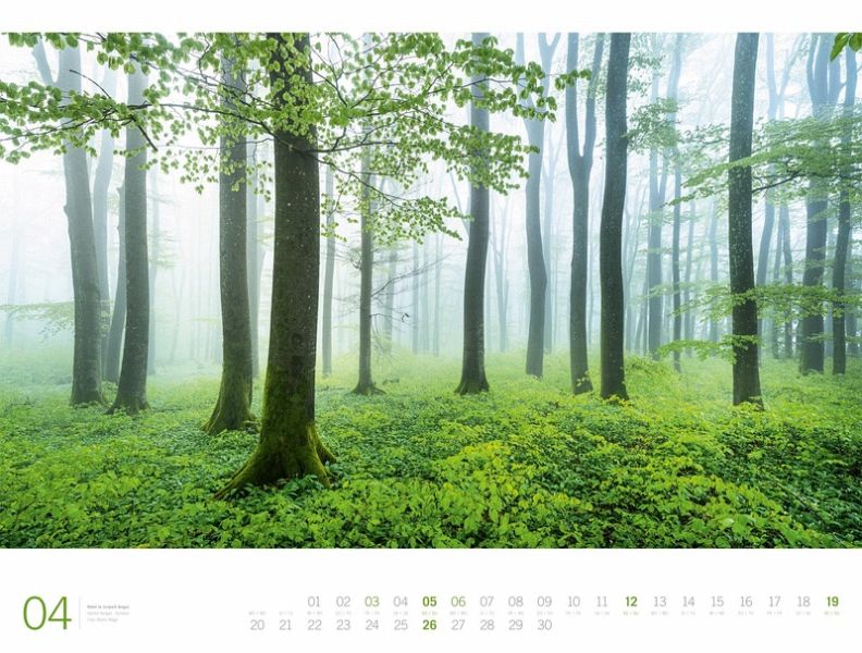Wenn es grün duftet, man weichen Boden unter den Füßen hat und immer wieder Sonnenstrahlen durch die Äste brechen, dann geht man mit Sicherheit gerade durch einen Wald. Die unverwechselbare Atmosphäre der dicht aneinander stehenden Bäume, Vogelgezwitscher und knackendes Holz versetzen Menschen bei jedem Waldspaziergang in einen besonderen Zustand der Entspannung - und das schaffen auch die atmosphärischen und lichtdurchfluteten Fotografien dieses Kalenders.