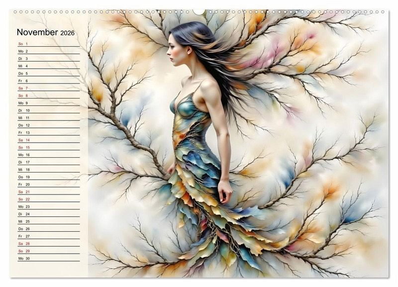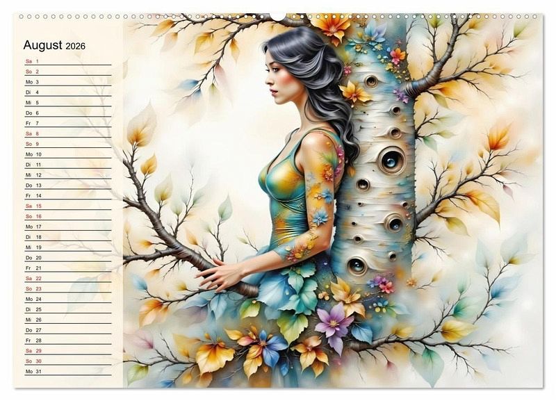 Tauchen Sie ein in ein Jahr voller Verwandlung und stiller Wunder. Dieser Kalender ist mit Hilfe von KI erstellt worden und zeigt die zarte Entstehung einer Frau, die aus Baumstamm, Ästen und Blattwerk geboren wird. Jeder Monat ist ein Augenblick zwischen Wurzel und Wind, Licht und Laub, wo Rinde zu Haut und Zweige zu Haaren werden. Die Bilder erzählen von Geduld, von Natursehnsucht und von einer Schönheit, die aus der Natur selbst emporwächst. Der Kalender bringt Poesie an Ihre Wand und verwandelt jeden Raum in einen geheimen Hain.