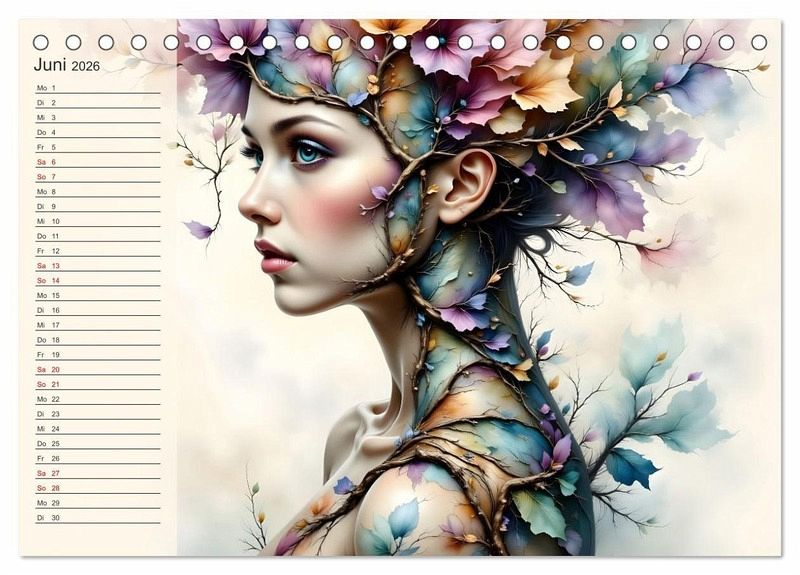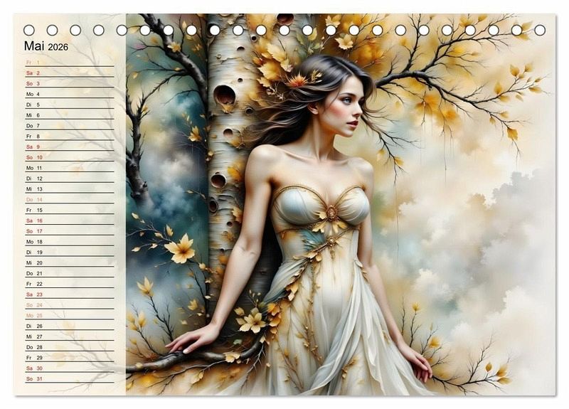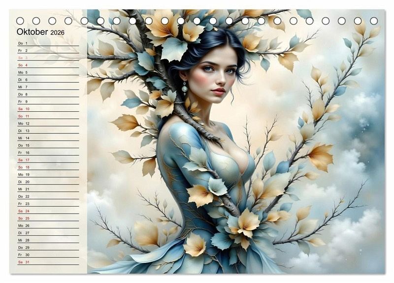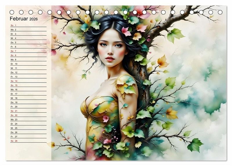 Tauchen Sie ein in ein Jahr voller Verwandlung und stiller Wunder. Dieser Kalender ist mit Hilfe von KI erstellt worden und zeigt die zarte Entstehung einer Frau, die aus Baumstamm, Ästen und Blattwerk geboren wird. Jeder Monat ist ein Augenblick zwischen Wurzel und Wind, Licht und Laub, wo Rinde zu Haut und Zweige zu Haaren werden. Die Bilder erzählen von Geduld, von Natursehnsucht und von einer Schönheit, die aus der Natur selbst emporwächst. Der Kalender bringt Poesie an Ihre Wand und verwandelt jeden Raum in einen geheimen Hain.