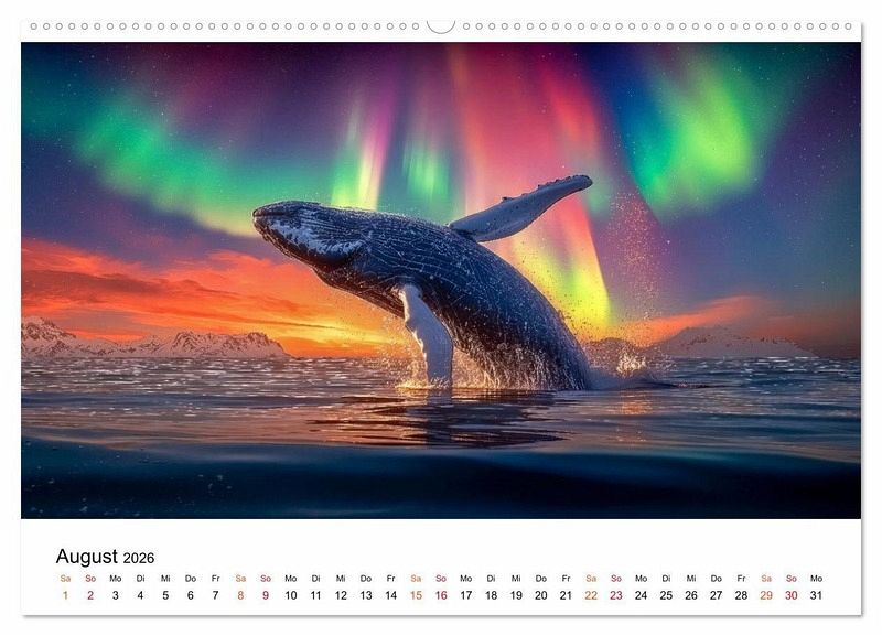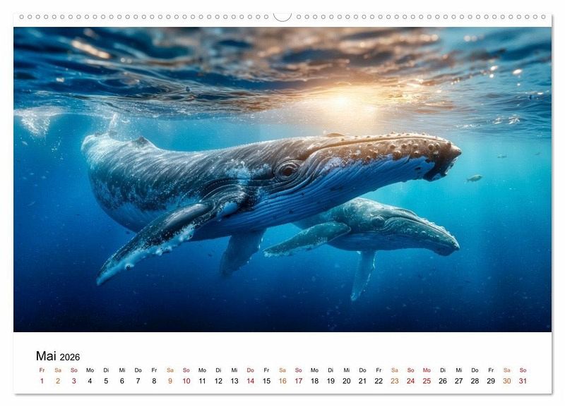 Tauchen Sie ein in die Welt der Ozean und bewundern Sie imposante Wale, die in eleganten Sprüngen die Wasseroberfläche durchbrechen, friedlich mit Artgenossen durch die Tiefen des Ozeans gleiten oder ihre mächtigen Schwanzflossen vor glutroten Sonnenuntergängen in den Himmel recken. Diese neuen atemberaubenden KI-generierten Bilder zeigen nicht nur die beeindruckende Größe dieser sanften Riesen - sie lassen uns staunen, innehalten, träumen, denn sie erinnern daran, wie groß, geheimnisvoll und majestätisch das Leben im Ozean ist - und wie tief es den Menschen berühren kann. Ein ideales Geschenk für alle Naturfreunde, Meeresbegeisterte und Tierfans.