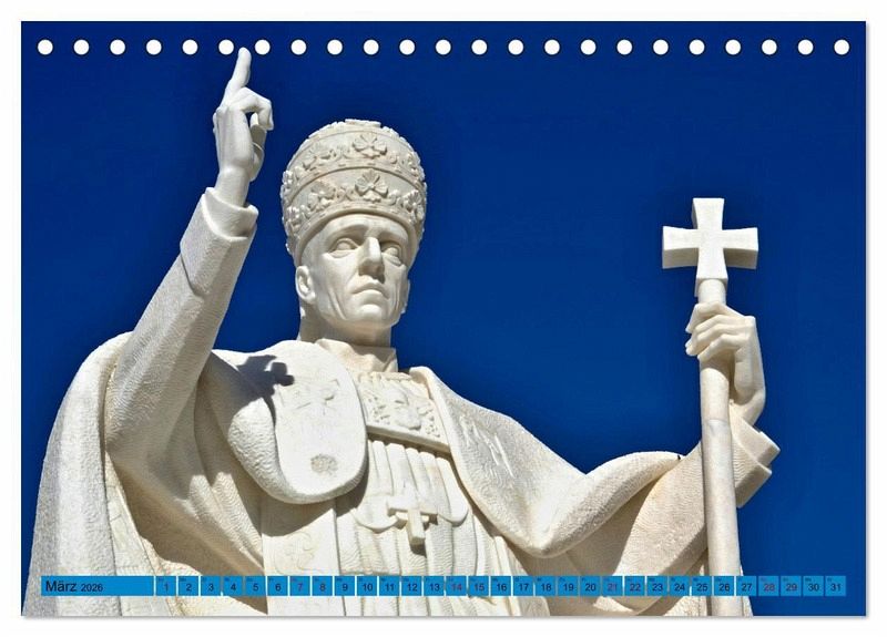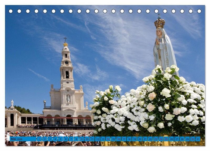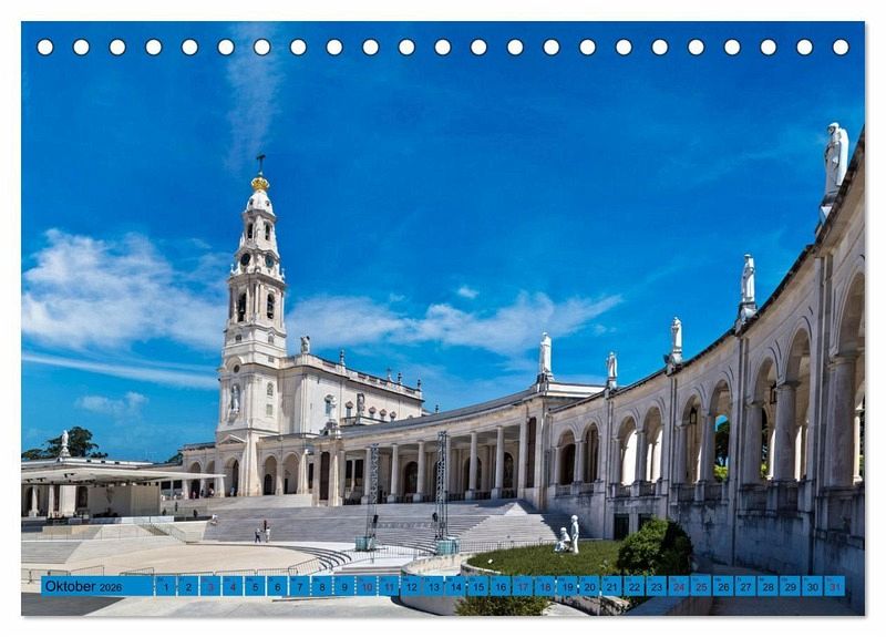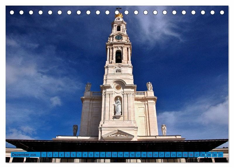 Ein Kalender aus der Serie Religion und Reisen. Fatima, ein bekannter Wallfahrtsort im Centro von Portugal. Drei Hirtenkinder sahen 1907 eine Marienerscheinung. Dieses Ereignis veränderte den Ort in ein modernes religiöses Zentrum . Wir haben hier einen interessanten Kalender geschaffen. Ein Mix aus Architektur, Geschichte und Religion