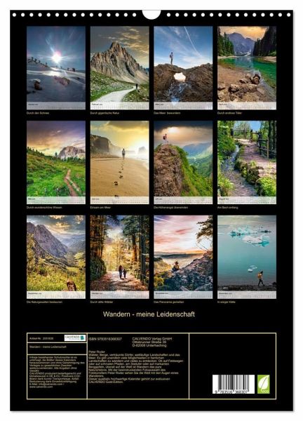 QUALITÄT - Hochwertiger Fotokalender mit 12 wunderschönen Motiven auf lichtbeständigem Bilderdruckpapier, robuste Spiralbindung mit Aufhängebügel.NACHHALTIG - deutliche Abfallreduzierung durch bedarfsgerechte Einzelstückfertigung, umweltfreundliches FSC-zertifiziertes Papier, Produktion in Deutschland, klimabewusste Logistik.PERFEKTES GESCHENK - Kalender für Freunde und Familie, für Kinder und Erwachsene, jung und alt, zu Weihnachten, Geburtstag oder zwischendurch.VIELFALT - Bildkalender in verschiedenen Formaten, z.B. DIN A5, DIN A4, DIN A3 sowie DIN A2. Ob Naturmotiv, Gemälde oder Fotos, ideal für ein persönliches Wohlfühlambiente.Wandern - Erholung für Seele, Körper und Geist. von Autor(in): Peter Roder