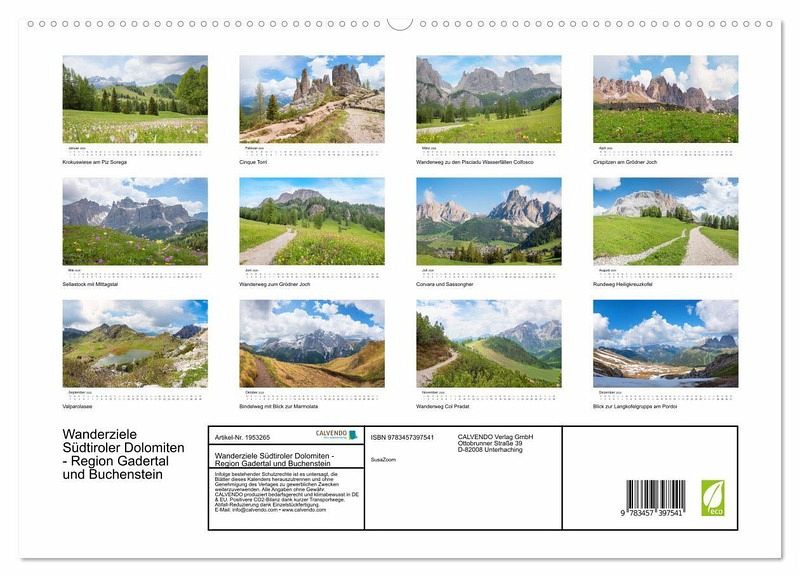 PREMIUM-LINIE - Brillanter Fotokalender mit 12 wunderschönen Motiven, Kunstdruck in Hochglanz in Museumsqualität.QUALITÄT - edle Materialien, stabile Rückwand mit 2 innovativen Einstecktaschen für eine optimale Präsentation an der Wand.NACHHALTIG - deutliche Abfallreduzierung durch bedarfsgerechte Einzelstückfertigung, umweltfreundliches FSC-zertifiziertes Papier, Produktion in Deutschland, klimabewusste Logistik.PERFEKTES GESCHENK - Kalender für Freunde und Familie, für Kinder und Erwachsene, jung und alt, zu Weihnachten, Geburtstag oder zwischendurch.Ausflugsziele in grandioser Alpenlandschaft der Dolomiten von Autor(in): SusaZoom
