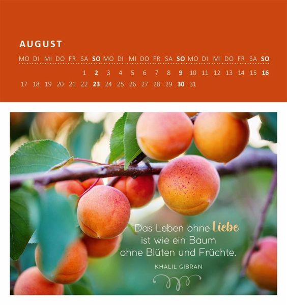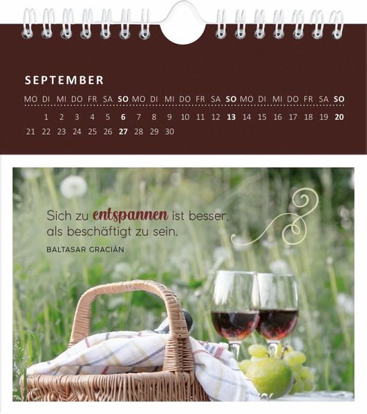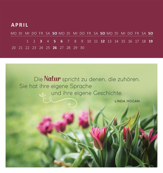 Im Trubel des Alltags bringt uns ein Blick ins Grüne zum Innehalten. Dieser Wandkalender bringt mit Sprüchen und stimmungsvollen Fotografien einen Gartenmoment mitten auf den Schreibtisch. Durch das praktische Monatskalendarium behält man stets den Überblick, egal ob im Büro oder zu Hause. Auf festem Papier gedruckt, lassen sich die 12 Bilder an der Perforation ganz leicht vom Kalendarium trennen und können so an liebe Menschen als Postkarte verschenkt oder verschickt werden. Durch seine geschmackvolle Gestaltung und die zusätzliche Aufstellfunktion ist der Kalender auch eine schöne Schreibtischdeko.