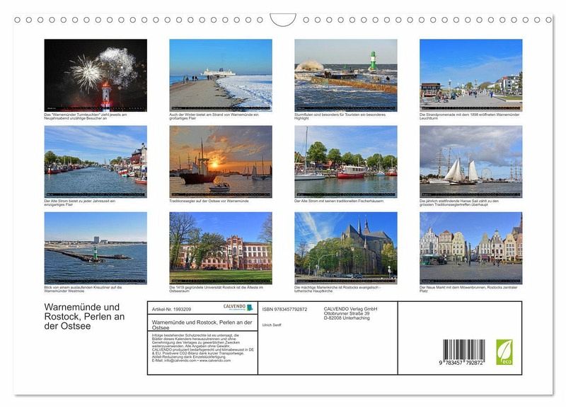 Das malerisch an der Ostsee gelegene Seebad Warnemünde mit seinem einzigartigen Flair und traumhaften Sandstrand ist ein ideales Urlauberparadies. Rostock, mit rund 200 000 Einwohnern, hat als Hansestadt und grösste Hafenstadt im Osten Deutschlands eine lange Geschichte. Großartige alte Baudenkmäler und moderne Elemente bilden hier ein wunderschönes Ensemble. Der in Rostock lebende Autor präsentiert im Kalender einige seiner beeindruckenden Bilder.