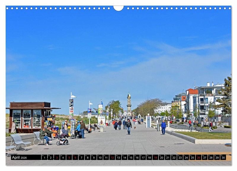 April: Die Strandpromenade mit dem 1898 eröffneten Warnemünder Leuchtturm