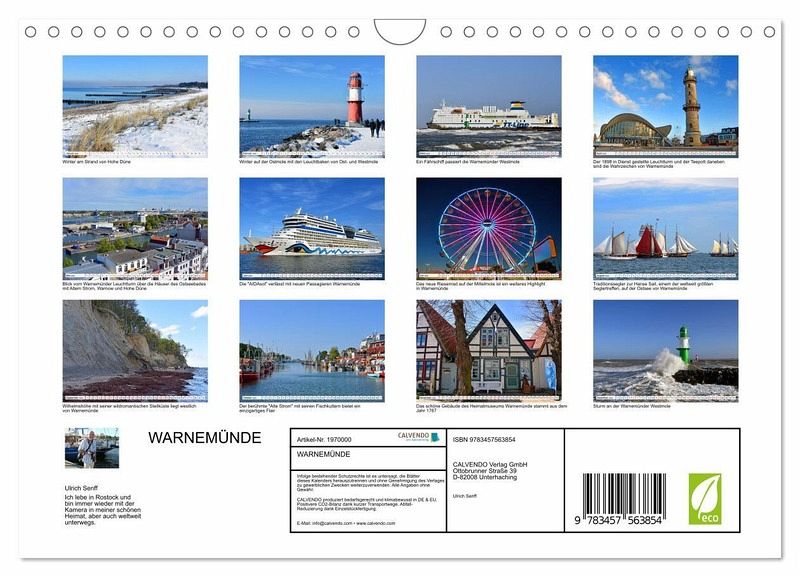 Das malerisch an der Ostsee gelegene Seebad Warnemünde mit seinem einzigartigen maritimen Flair und schönen Sandstrand ist ein zu jeder Jahreszeit unvergessliches Urlaubshighlight. Warnemünde bietet mit Sehenswürdigkeiten wie Alter Strom, Warnow und Kreuzschifffahrt weitaus mehr als ein übliches Strandbad. Der in Rostock lebende Autor präsentiert im Kalender einige seiner beeindruckenden Bilder von diesem sehenswerten Ort.