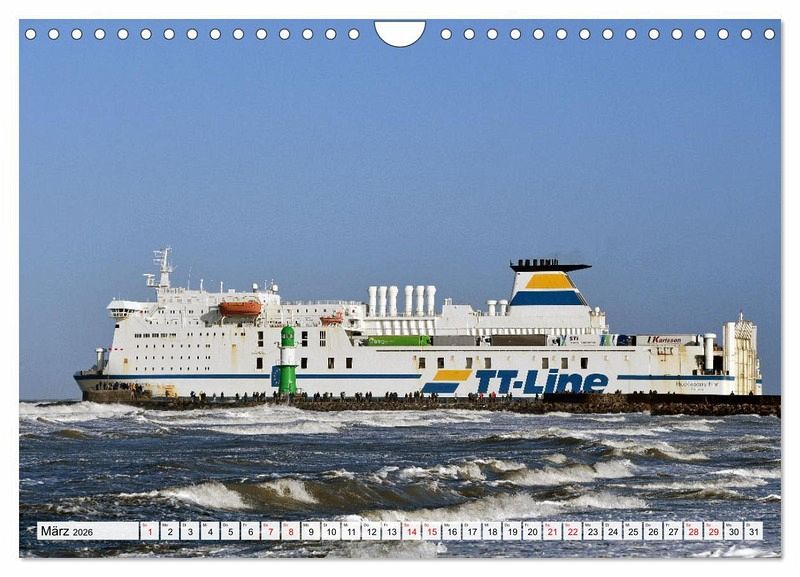 März: Ein Fährschiff passiert die Warnemünder Westmole