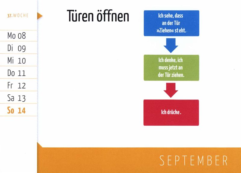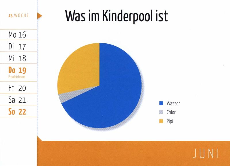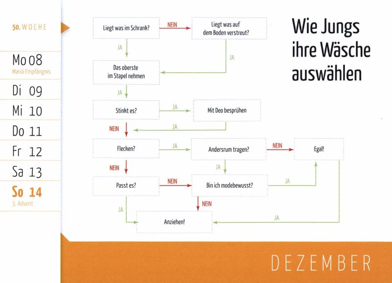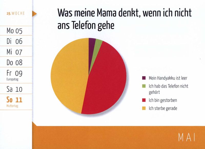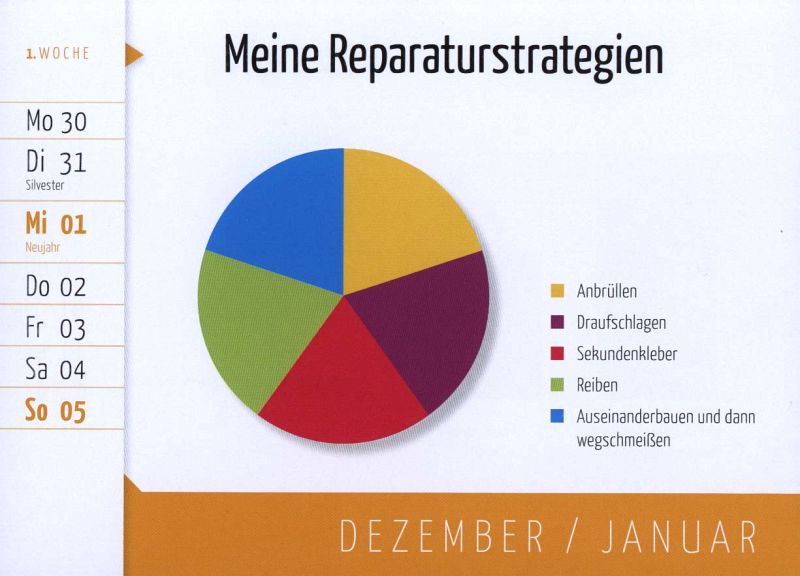 denn der Kalender enthält ein Blatt pro Woche. Darunter sind so schöne Übersichten wie „Beilagen,…mehr„Was wir tun, wenn der Aufzug nicht kommt“ ist eigentlich ein Bilderbuch mit lustigen Grafiken zu Alltagssituationen, basierend auf der Website graphitti-blog.de. Die witzigsten dieser Grafiken, die die Welt erklären, sind in diesem stabilen Tisch-Kalender zum Aufstellen versammelt - insgesamt 53, denn der Kalender enthält ein Blatt pro Woche. Darunter sind so schöne Übersichten wie „Beilagen, die Männer mögen“ (Grillsauchen, Senf, Ketchup etc.), „Wo Leichen im Tatort gefunden werden“ (bei Spaziergängen im Wald, in Parkhäusern, im Keller etc.) oder „Wofür Heimtrainer benutzt werden“ (Wäscheständer, Gewissen verbessern etc.) und Diagramme zu Themen wie „Erotische Kommunikation“ oder „Gehe ich joggen?“. Ein wirklich witziger Kalender, in den geschilderten Situationen erkennt man sich oft wieder, die Reaktionen reichen vom leichten Schmunzeln bis zum lauten Auflachen. Damit werde ich auf dem Schreibtisch in 2014 wenigstens immer wieder einen Lichtblick entdecken ;-)