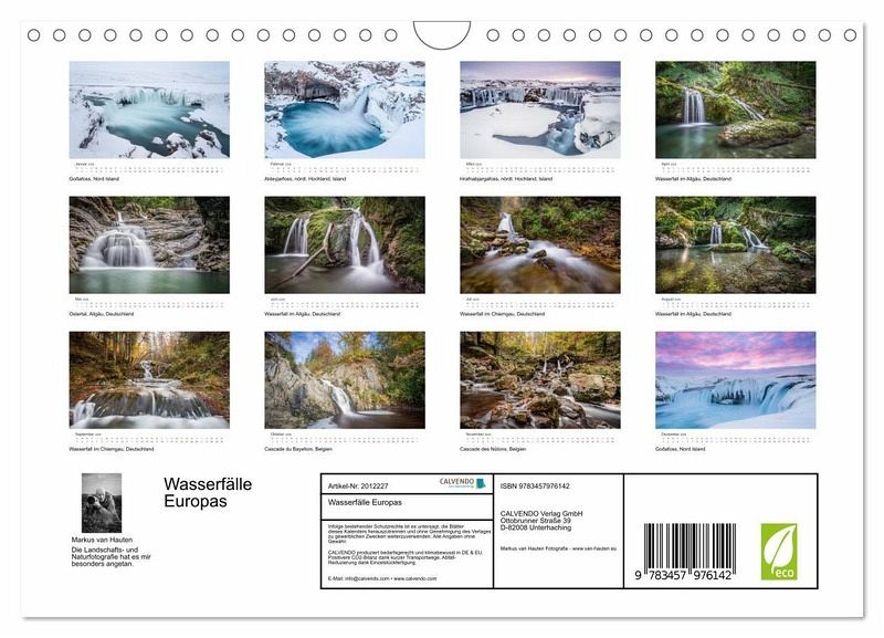 QUALITÄT - Hochwertiger Fotokalender mit 12 wunderschönen Motiven auf lichtbeständigem Bilderdruckpapier, robuste Spiralbindung mit Aufhängebügel.NACHHALTIG - deutliche Abfallreduzierung durch bedarfsgerechte Einzelstückfertigung, umweltfreundliches FSC-zertifiziertes Papier, Produktion in Deutschland, klimabewusste Logistik.PERFEKTES GESCHENK - Kalender für Freunde und Familie, für Kinder und Erwachsene, jung und alt, zu Weihnachten, Geburtstag oder zwischendurch.VIELFALT - Bildkalender in verschiedenen Formaten, z.B. DIN A5, DIN A4, DIN A3 sowie DIN A2. Ob Naturmotiv, Gemälde oder Fotos, ideal für ein persönliches Wohlfühlambiente.Eine kleine Auswahl europäischer Wasserfälle von Autor(in): Markus van Hauten