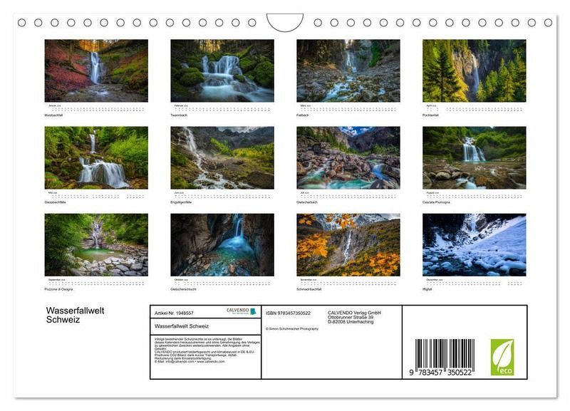 QUALITÄT - Hochwertiger Fotokalender mit 12 wunderschönen Motiven auf lichtbeständigem Bilderdruckpapier, robuste Spiralbindung mit Aufhängebügel.NACHHALTIG - deutliche Abfallreduzierung durch bedarfsgerechte Einzelstückfertigung, umweltfreundliches FSC-zertifiziertes Papier, Produktion in Deutschland, klimabewusste Logistik.PERFEKTES GESCHENK - Kalender für Freunde und Familie, für Kinder und Erwachsene, jung und alt, zu Weihnachten, Geburtstag oder zwischendurch.VIELFALT - Bildkalender in verschiedenen Formaten, z.B. DIN A5, DIN A4, DIN A3 sowie DIN A2. Ob Naturmotiv, Gemälde oder Fotos, ideal für ein persönliches Wohlfühlambiente.Landschaftsfotokalender mit den schönsten und beeindruckendsten Wasserfalllandschaften der Schweiz. von Autor(in): Simon Schuhmacher