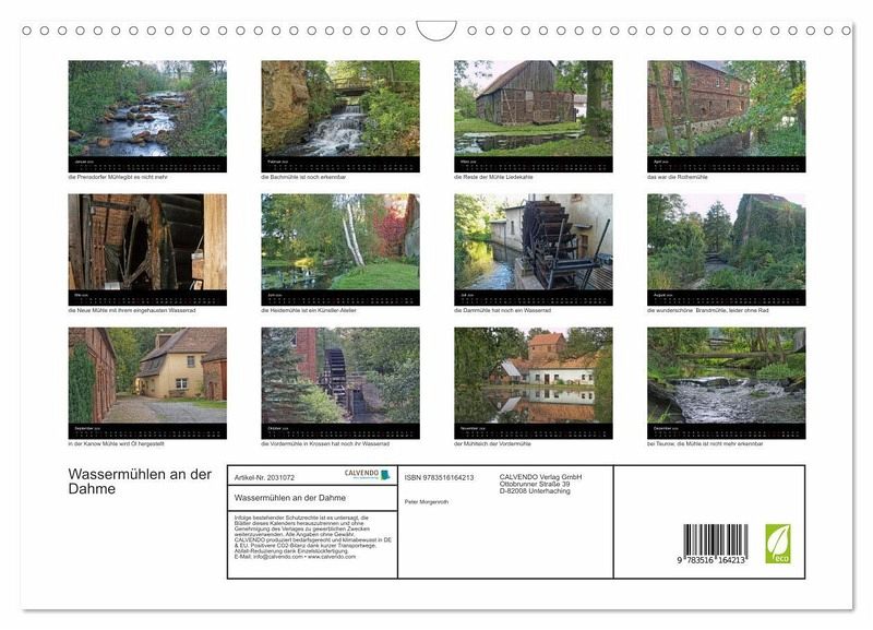 An der Dahme, da wo sie noch ganz klein ist und bevor sie mit der Spree zusammen fliest, da standen einmal 15 Wassermühlen. Heutzutage sind einige der Mühlen gar nicht mehr als solche zu erkennen, einigen kann man ihre Vergangenheit noch ansehen, wenn man genau hin schaut. Nur 3 Mühlen hatten überhaupt noch ein Wasserrad. Mühlen, die irgend etwas mahlen, sind sie auch nicht mehr. 2008 habe ich fotografiert, was es da noch zu fotografieren gab. Eine Webseite habe ich gemacht ( http://www.petmo.de/DaMue/index.html ) und ein Fotobuch bei BookRix ( http://www.bookrix.de/_ebook-peter-morgenroth-die-dahme-und-ihre-wassermuehlen/ ). Nun diesen Kalender.