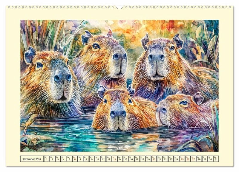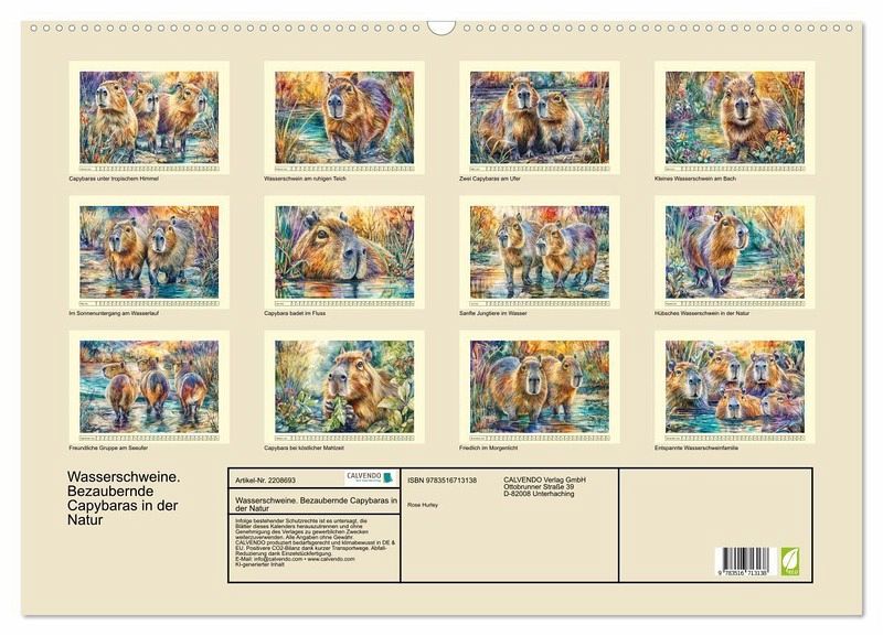 Dieser Kalender widmet sich den friedlichen und beliebten Capybaras, die in Aquarellfarben besonders sanft und idyllisch wirken. Jede Monatsillustration zeigt die hübschen Wasserschweine in einer stimmungsvollen Umgebung - am Wasser, im Gras und beim geselligen Zusammensein. Alle Motive wurden mit der Hilfe von KI erstellt und wurden in warmen, freundlichen Farben gestaltet um Ruhe und harmonische Natur zu vermitteln. So entstand ein künstlerischer Begleiter durchs Jahr, der Freude in den Alltag bringt.