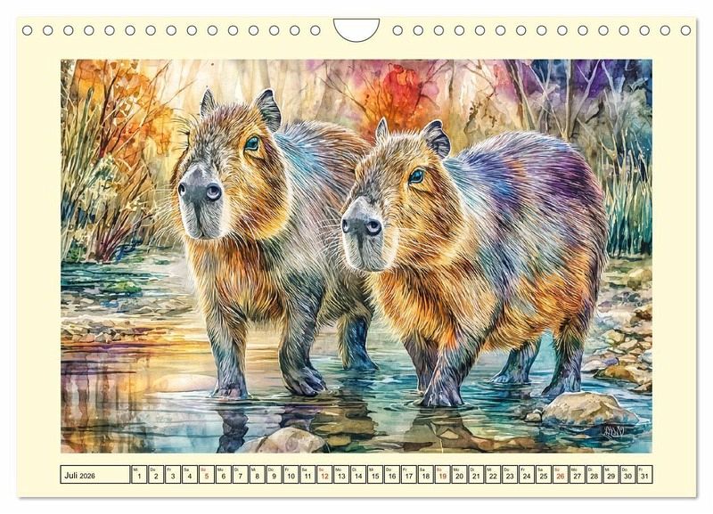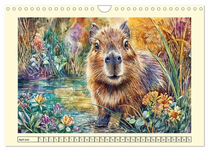 Dieser Kalender widmet sich den friedlichen und beliebten Capybaras, die in Aquarellfarben besonders sanft und idyllisch wirken. Jede Monatsillustration zeigt die hübschen Wasserschweine in einer stimmungsvollen Umgebung - am Wasser, im Gras und beim geselligen Zusammensein. Alle Motive wurden mit der Hilfe von KI erstellt und wurden in warmen, freundlichen Farben gestaltet um Ruhe und harmonische Natur zu vermitteln. So entstand ein künstlerischer Begleiter durchs Jahr, der Freude in den Alltag bringt.