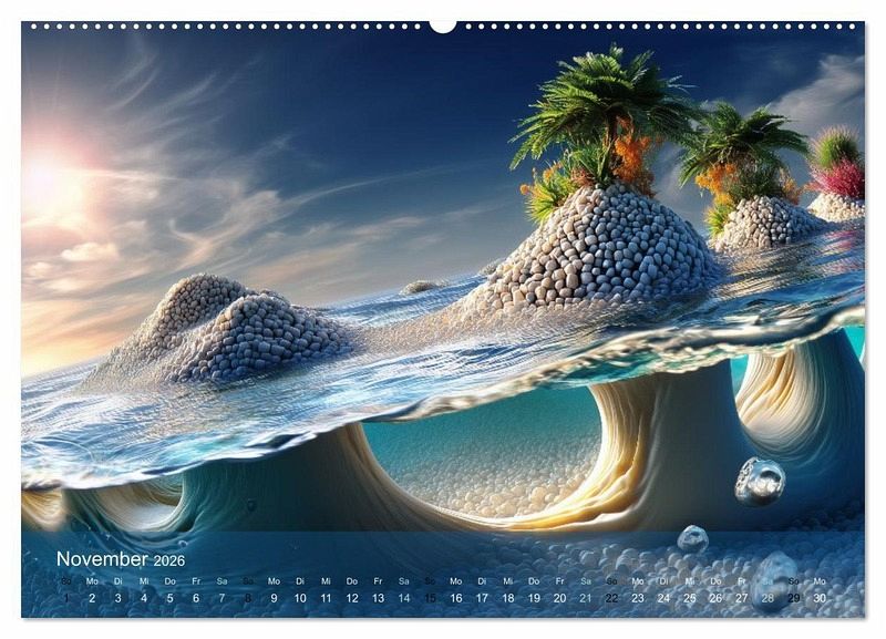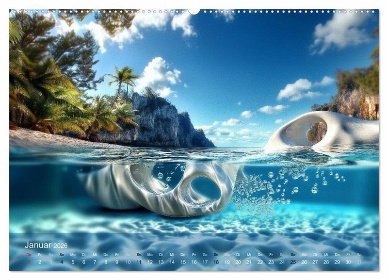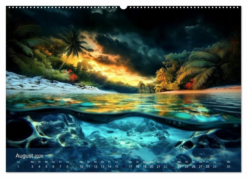 Erlebe das Unwirklich-Schöne - wo Fantasie auf Natur trifft. Der Blick unter die Wasseroberfläche. Tauche ein in eine Welt, in der die Wirklichkeit glitzert wie ein Traum. Wo das Meer smaragdgrün pulsiert, Wellen im Licht der Sterne tanzen und der Atem der Natur in jedem Windhauch spürbar wird. Am Horizont verschmilzt goldenes Sonnenlicht mit tropischer Wildnis - Palmen, Farne und leuchtende Blüten wiegen sich im Rhythmus der Stille. Unter der Wasseroberfläche öffnet sich ein neues Universum: tiefblau, geheimnisvoll, magisch. Hier ist jeder Augenblick ein Kunstwerk. Ein Ort zum Staunen, Atmen, Träumen. Alle Bilder wurden in mehreren Schritten mit Hilfe modernster KI-Technologie gestaltet.