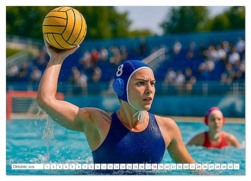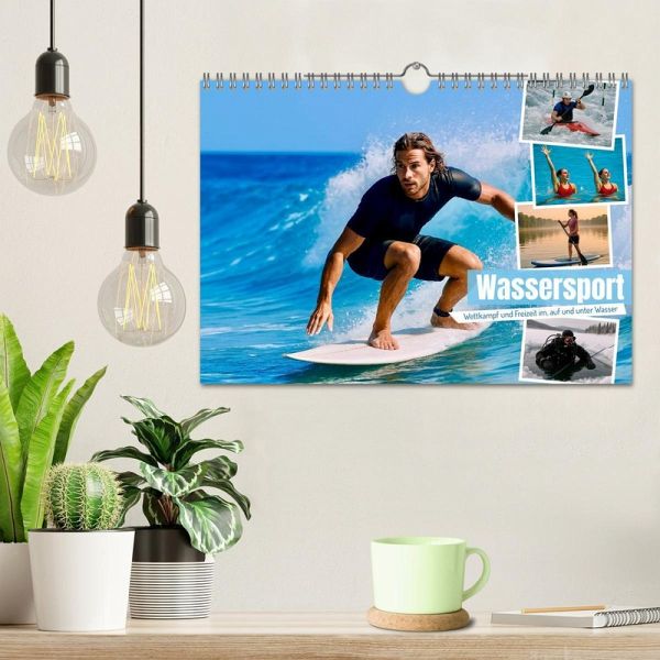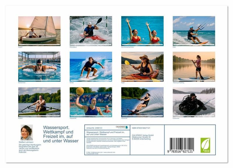 Ob im Ruderboot oder beim Kanuslalom, ob Surfen oder Kiten, ob Wasserball oder Schwimmen - wer Wassersport betreibt, hat immer Spaß und Action. Die verschiedenen Facetten des Wassersports zeigt Steffani Lehmann mit diesem abwechslungsreichen Kalender, dessen Bilder mit Unterstützung einer KI editiert wurden.