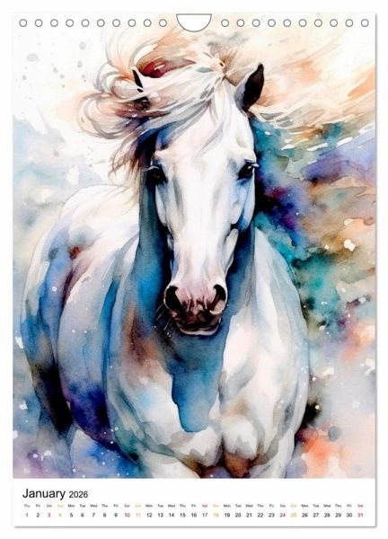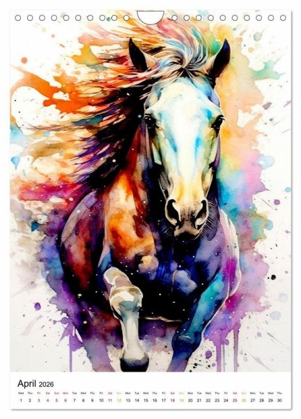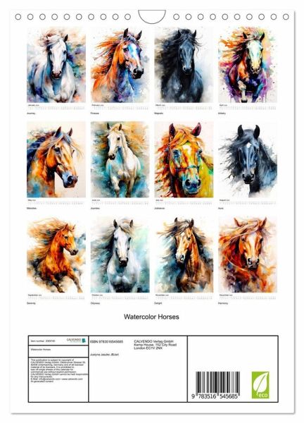 QUALITY - High-quality photo calendar with 12 beautiful images on light-resistant paper, robust spiral binding with hanger.SUSTAINABLE - Significant waste reduction due to print-on-demand production, environmentally friendly FSC-certified paper, produced in the UK, climate-conscious logistical processes.PERFECT GIFT - calendars for friends and family, for children, all ages and all occasions, from Christmas to birthdays and everything in between.LOTS OF CHOICE - Wall calendars in different sizes (DIN A4 and DIN A3), for any topic and personal taste, featuring photography, painting and illustrations.Immerse yourself in the captivating beauty of Watercolor Horses, a stunning calendar showcasingthe graceful and vibrant spirit of these magnificent creatures through mesmerizing watercolor artworks., author: JBJart