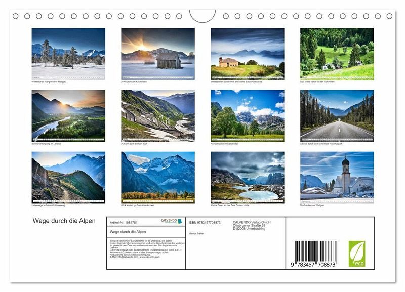 QUALITÄT - Hochwertiger Fotokalender mit 12 wunderschönen Motiven auf lichtbeständigem Bilderdruckpapier, robuste Spiralbindung mit Aufhängebügel.NACHHALTIG - deutliche Abfallreduzierung durch bedarfsgerechte Einzelstückfertigung, umweltfreundliches FSC-zertifiziertes Papier, Produktion in Deutschland, klimabewusste Logistik.PERFEKTES GESCHENK - Kalender für Freunde und Familie, für Kinder und Erwachsene, jung und alt, zu Weihnachten, Geburtstag oder zwischendurch.VIELFALT - Bildkalender in verschiedenen Formaten, z.B. DIN A5, DIN A4, DIN A3 sowie DIN A2. Ob Naturmotiv, Gemälde oder Fotos, ideal für ein persönliches Wohlfühlambiente.Unterwegs in den Alpen begleitet von kleinen Orten am Wegesrand und großen Ausblicken. von Autor(in): Markus Treffer