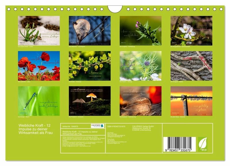 QUALITÄT - Hochwertiger Fotokalender mit 12 wunderschönen Motiven auf lichtbeständigem Bilderdruckpapier, robuste Spiralbindung mit Aufhängebügel.NACHHALTIG - deutliche Abfallreduzierung durch bedarfsgerechte Einzelstückfertigung, umweltfreundliches FSC-zertifiziertes Papier, Produktion in Deutschland, klimabewusste Logistik.PERFEKTES GESCHENK - Kalender für Freunde und Familie, für Kinder und Erwachsene, jung und alt, zu Weihnachten, Geburtstag oder zwischendurch.VIELFALT - Bildkalender in verschiedenen Formaten, z.B. DIN A5, DIN A4, DIN A3 sowie DIN A2. Ob Naturmotiv, Gemälde oder Fotos, ideal für ein persönliches Wohlfühlambiente.Monat für Monat Inspiration, Erdung und Schönheit, die dich stärken. von Autor(in): Ute Jackisch