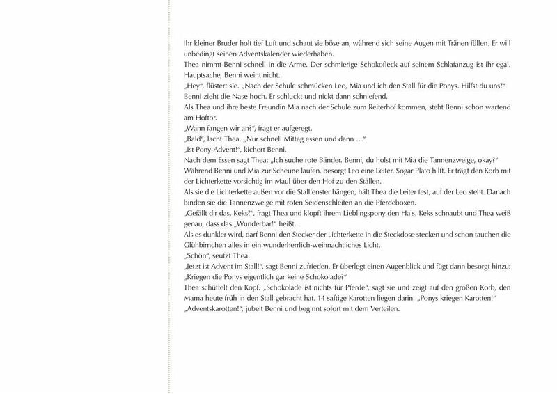 Thea freut sich wahnsinnig auf Weihnachten. Gemeinsam mit ihren Brüdern und ihrer besten Freundin Mia backt sie Plätzchen, nimmt an einem Adventsturnier teil, schmückt den Pferdestall weihnachtlich und macht einen Ausritt mit Folgen. Immer dabei sind natürlich die Ponys Keks und Rabe.